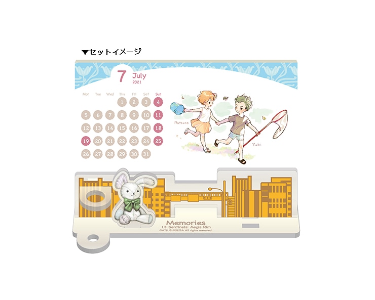『十三機兵防衛圏』のキャラクターデザイン・平井有紀子氏(ヴァニラウェア)による、主人公たちの記憶の一幕が描かれたイラストを収録。アクリル製のスタンドにカードをたてる仕様になっており、カレンダーとして使い終わったあとは、カード裏面のイラストを飾って卓上POPとしても楽しむことができます。