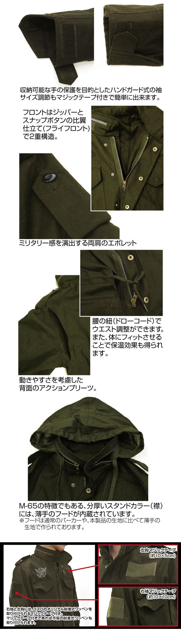 ・右袖と左胸には、コスパのオリジナル脱着式ワッペンを取り付けられるマジックテープ付き。