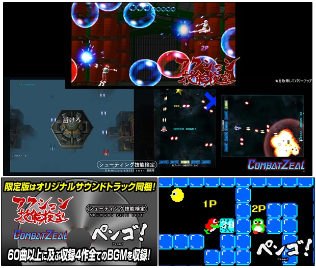 簡単操作シンプルなルールのミニゲームをプレイしてゲーマー年齢を測定する「アクション技能検定」。ワイド画面に対応し新たなゲームを追加してパワーアップした「シューティング技能検定」。プレイヤー数分独立したゲーム画面を持ち同じ敵を相手より早く倒す事で相手を攻撃したり、アイテムを取得する事により相手の邪魔をするといった対戦特化シューティング「コンバットジール」。いずれのゲームも4人までの対戦プレイに対応!