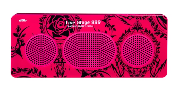 本商品は、Bluetoothスピーカー「Live Stage 999」に大人気の2D対戦格闘ゲーム『BLAZBLUE』のキャラクター「レイチェル=アルカード(RACHEL=ALUCARD)」をイメージしたカラーと同キャラクターのデザインを採用し、さらに特別限定ステッカーを配しています。