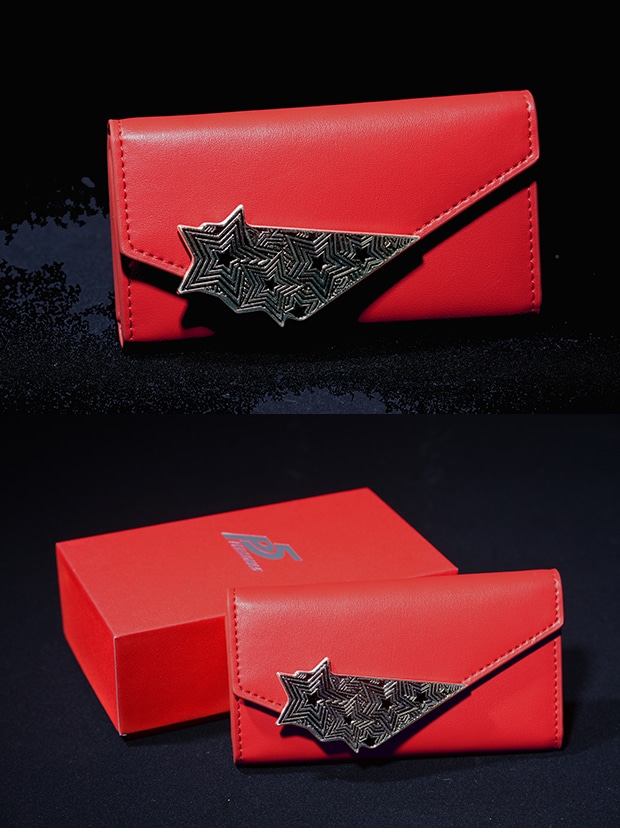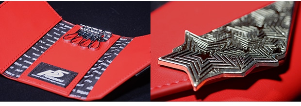 『ペルソナ5』の本革のキーケースの登場です。タイトルカラーの真紅のボディとオリジナルの星形ホック。 裏生地には、『ペルソナ5』で登場したタロットカードの名称がプリントされています。普段使い出来るデザインになっています