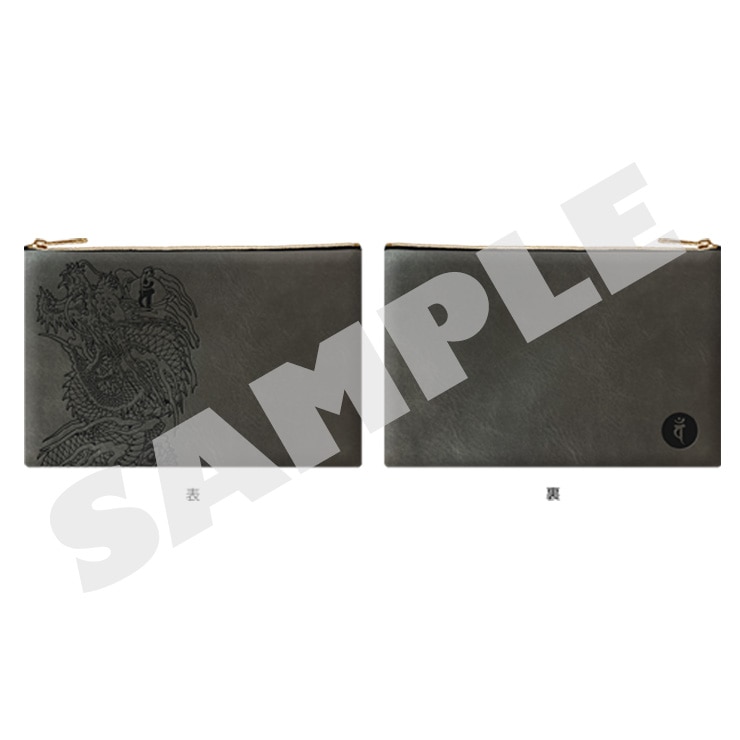 表面に桐生・春日・峯の刺青、背面にはそれぞれのキャラクターを象徴するアイテムをエンボスでクールにデザインしたポーチです。グレーの合皮で落ち着きと高級感を演出。内側は各キャラクターの色味の布地になっています。