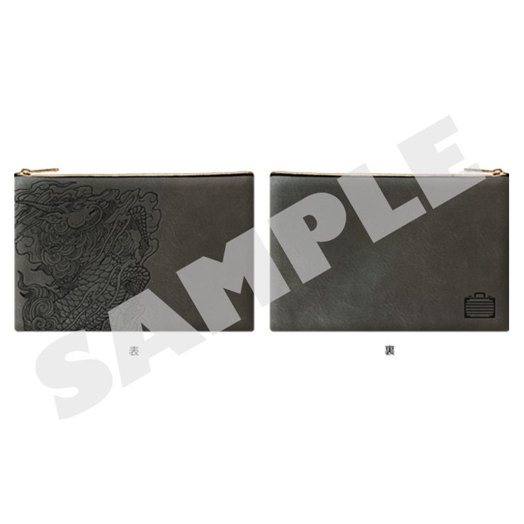 表面に桐生・春日・峯の刺青、背面にはそれぞれのキャラクターを象徴するアイテムをエンボスでクールにデザインしたポーチです。グレーの合皮で落ち着きと高級感を演出。内側は各キャラクターの色味の布地になっています。