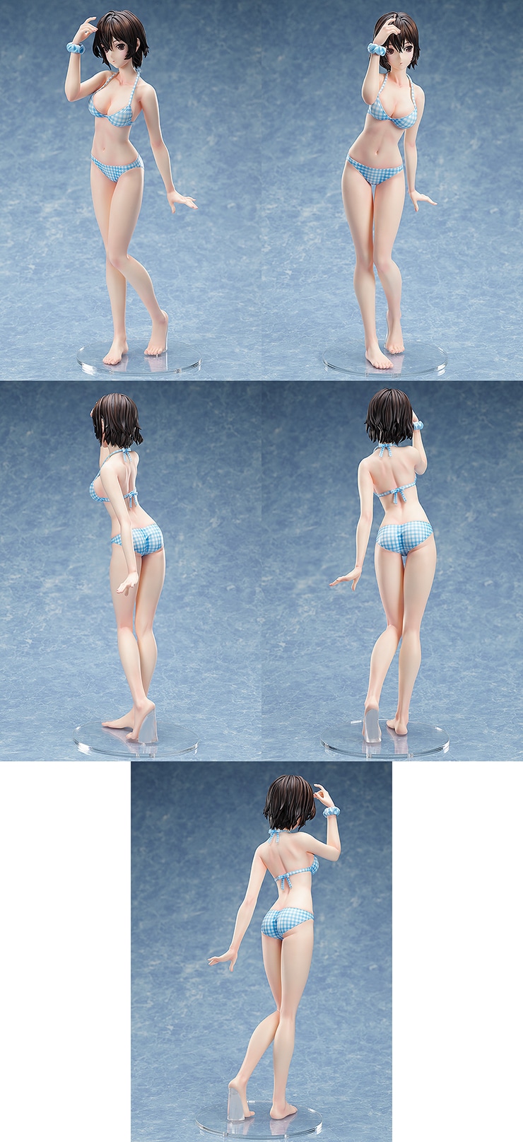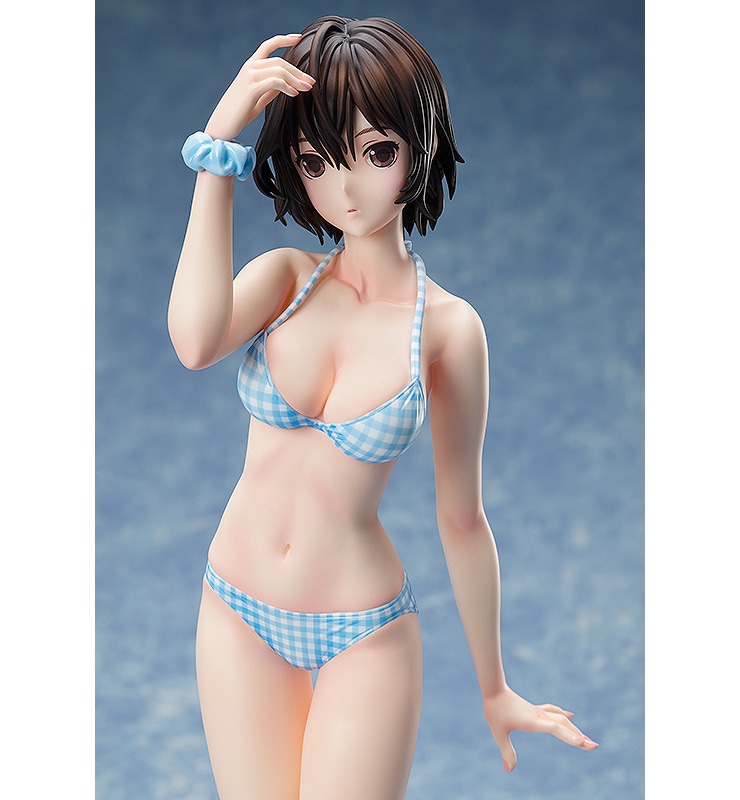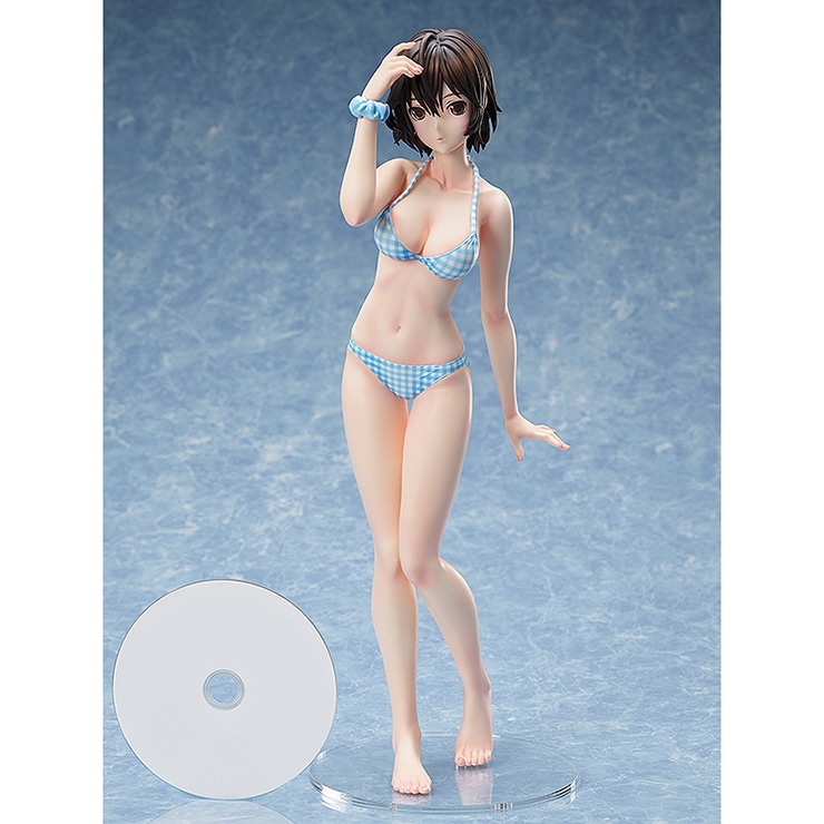 コスチュームは公式イラストをもとに、ブルー&ホワイトが爽やかなチェック柄のセパレート水着を再現しました。全高約400mmの大ボリューム。いつもとは少し違うセミロングのヘアスタイルのマナカから目が離せません。