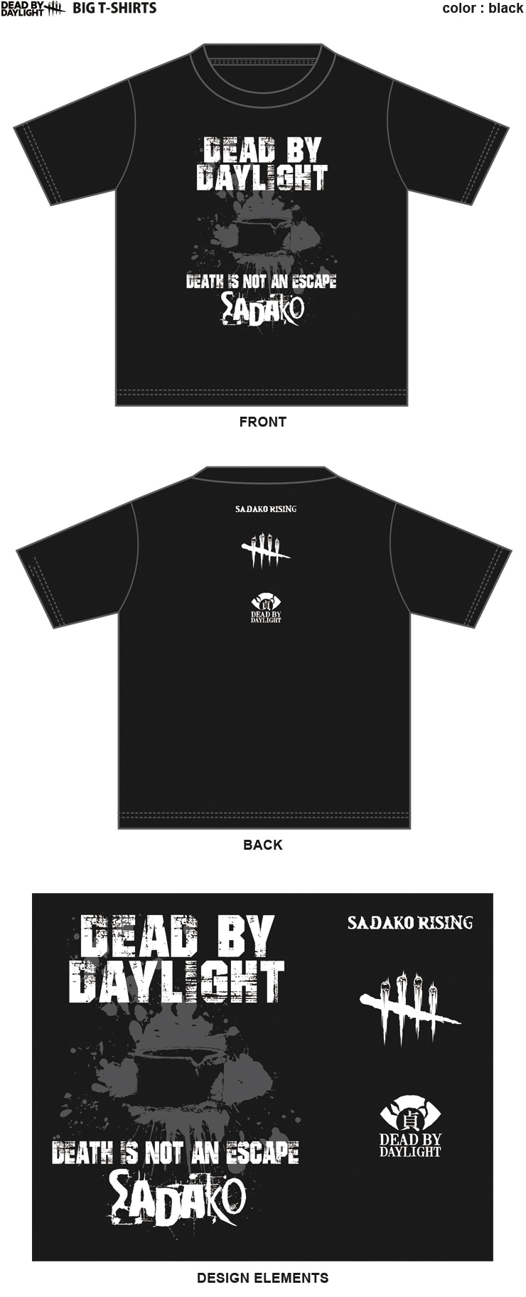 ゆったりとしたサイズのビッグTシャツ。前面には”DEAD BY DAYLIGHT”の文字とDEATH IS NOT AN ESCAPE SADAKOの文字の間に井戸のモチーフが。背面にはそれぞれのアイコンなどがあしらわれています。