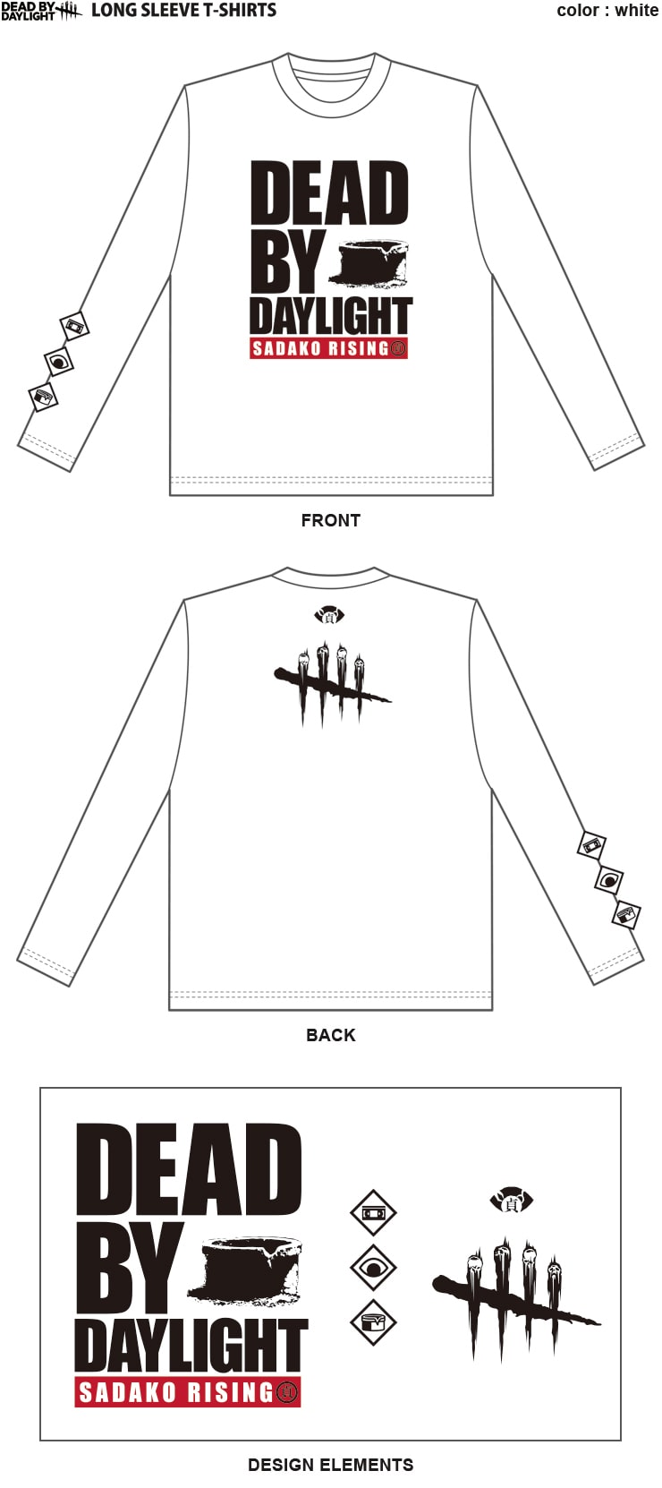 こちらは長袖Tシャツ。前面の”DEAD BY DAYLIGHT”の文字と貞子の"井戸”の組み合わせがとにかく新鮮。背面にはDEAD BY DAYLIGHTのロゴの一部をシンプルにあしらい、右の袖口には貞子を想起させる、ビデオテープ、目、井戸のアイコン3種がデザインされています。