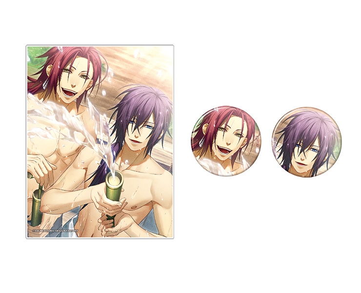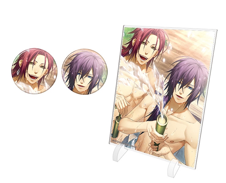 「B's-LOG」描き下ろしイラストを使用したアクリルパネルと缶バッジ2種のセットです。