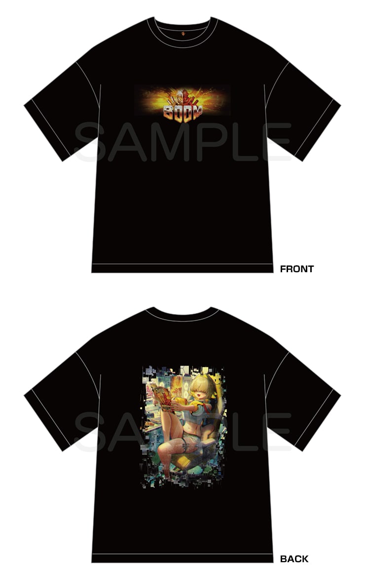 表面は「BOOM」のロゴ。背面はエレグの描き下ろしイラストをプリントしたTシャツ。