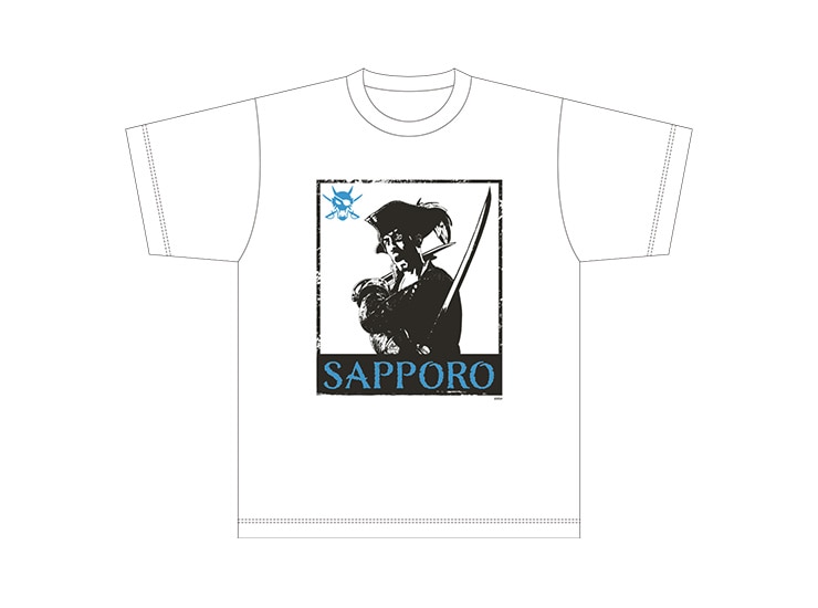 「パイレーツスタイル」の真島のビジュアルと「真島のマジ祭り」開催地である札幌6都市の名称が入ったTシャツです!