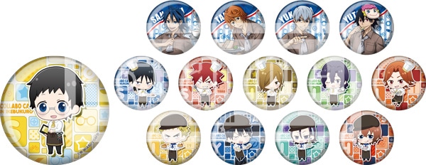 丸型缶バッジにコラボカフェ描き下ろし等身イラストとSDイラストを配しました。何が出るかはお楽しみ!