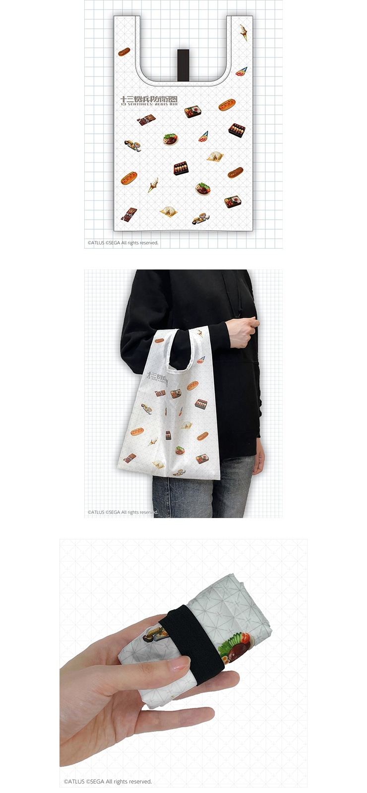 アトラス×ヴァニラウェアがタッグを組んで放つ快作SFアドベンチャーゲーム『十三機兵防衛圏』。作中で描かれる、おいしそうなビジュアルの食べ物……ファンには“ヴァニラ飯”と呼ばれ愛されているその食べ物の数々を、エコバッグにかわいくプリント!コンビニなどでの買い物にちょうどいいサイズで、バッグの中に入れておけば重宝すること間違いなし。厚手で丈夫な素材でありながら、くるっと丸めて小さくまとめられるところもポイントです。さり気なく『十三機兵防衛圏』を日常で持ち歩けるアイテムとして、チェックしてみてください。