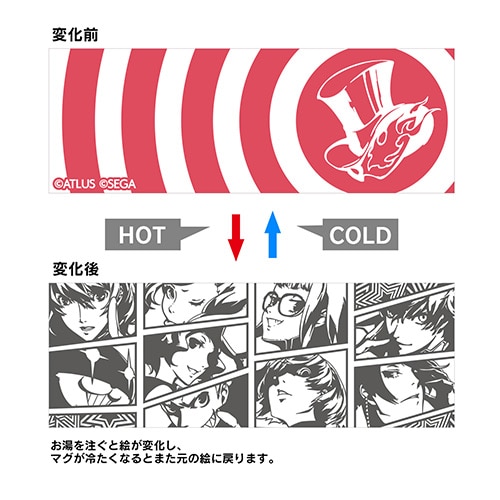 温度に反応する特殊なインクを使⽤しており、マグカップに温かい飲み物を⼊れると、怪盗団の総攻撃イラストがカットインします。