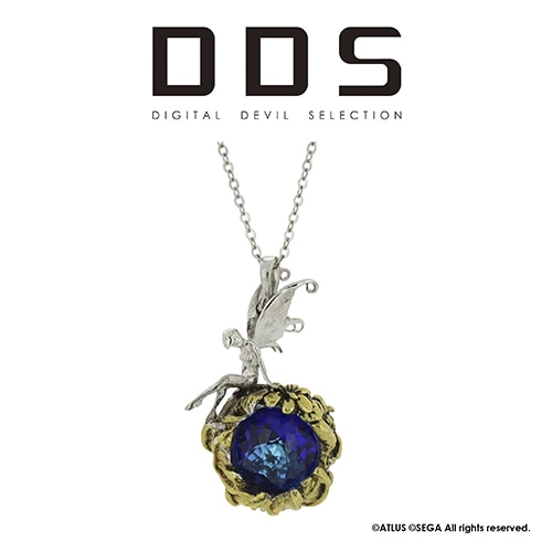 妖精郷をイメージしており、バミューダブルーカラーの魔石、妖精の住まう樹木をモチーフにした真鍮、そしてその上に軽やかに座る妖精ピクシーが美しいネックレス。