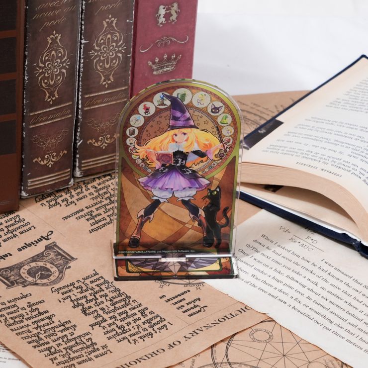 作品世界をイメージした背景デザインになっているのも魅力のひとつ。アクリルは透明・半透明加工を施しており、飾るシーンや光の加減によって、その表情はステンドグラスのようにさまざまに変化します。