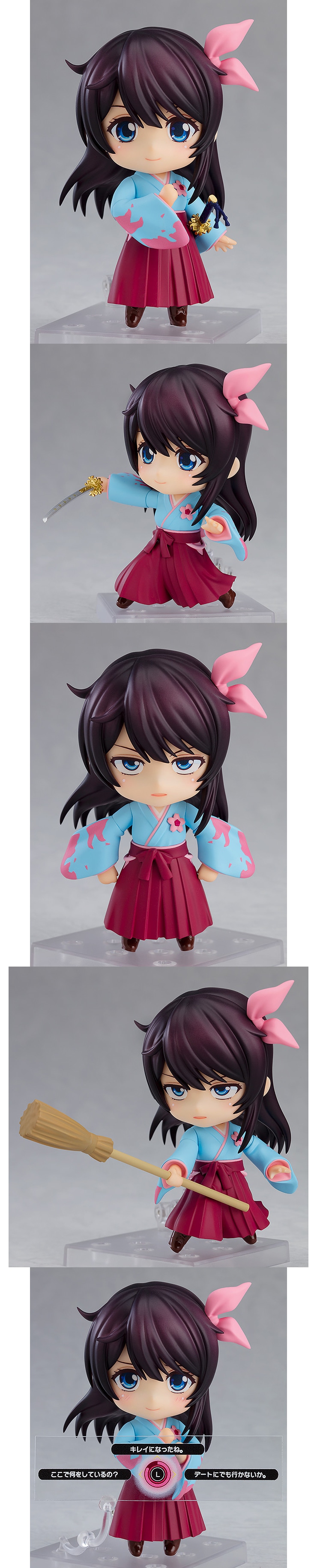 交換用表情パーツは芯の強さがうかがえる「通常顔」や、懐疑的な「ジト目顔」のほか、不意をつかれたような「照れ顔」をご用意。また、愛用の「天宮國定」は納刀・抜刀時が再現可能となっており、「竹箒」や「踏み込み用下半身パーツ」のほか、ゲーム演出をイメージした「選択肢プレート」もお付けいたします。