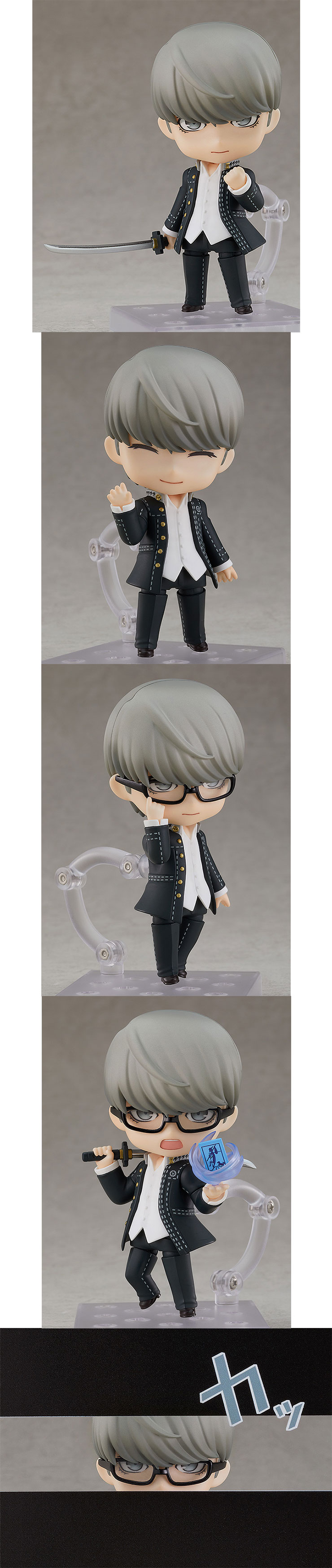 交換用表情パーツは、通常顔、真剣顔、笑顔が付属。 ペルソナ4シリーズのキーアイテムであるメガネが一体になった前髪も付属しますので、各表情をメガネ姿でも再現できます。