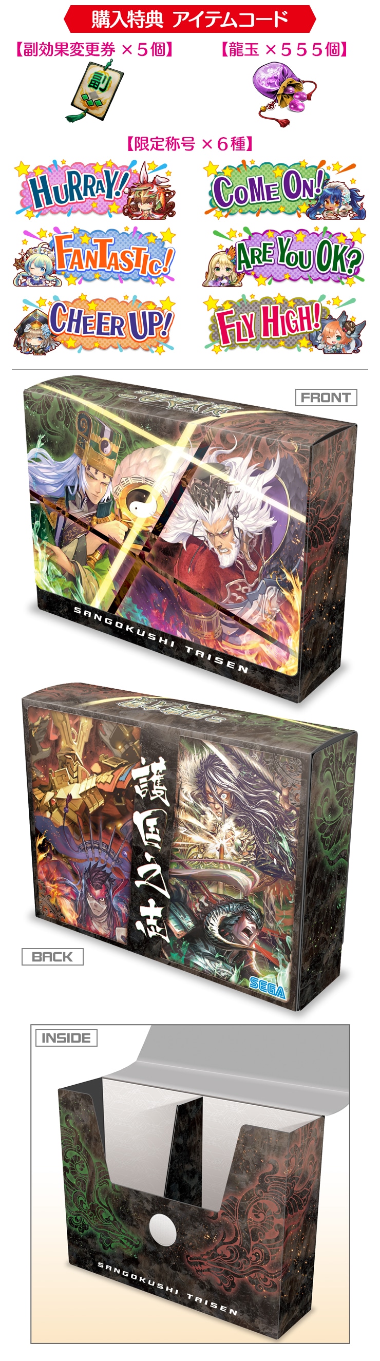 購入特典として、ダブルデッキケース1点につきゲーム内で使えるアイテムコード(将器副効果変更券5枚+龍玉555個+限定称号6種)をプレゼント!