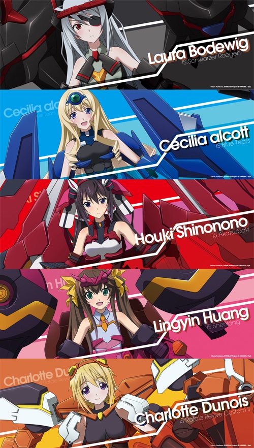 ラウラ、セシリア、箒、鈴音、シャルロットのイラストをそれぞれ配したA3半裁サイズ(149mm×420mm)のポスターです。