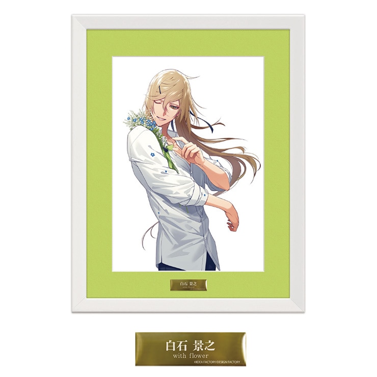 オトメイトのキャラクター描きおろしグラビア企画、“with flower”シリーズから、B’s-LOG本誌2022年11月号~2023年4月号に掲載された、全12キャラクターを額装した複製原画です。高画質印刷技術により国宝や重要文化財などのレプリカ製作に応用され、高い評価を得ている技法で複製し額装しました。高級感のある金属プレートにはキャラクター名を施しています。