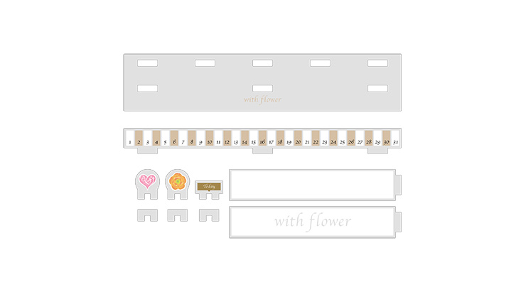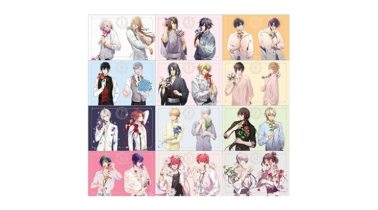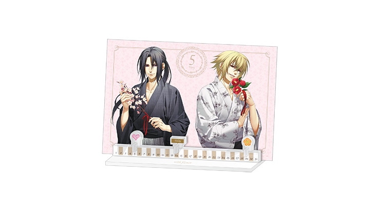 オトメイトのキャラクター描きおろしグラビア企画、” with flower”シリーズから、B’s-LOG 2022年5月号~2023年4月号に掲載された、全24キャラクターを掲載月ごとにペーパーのカードにデザインした万年カレンダーです。台座部分やカレンダーを飾る小パーツはアクリル素材となっております。