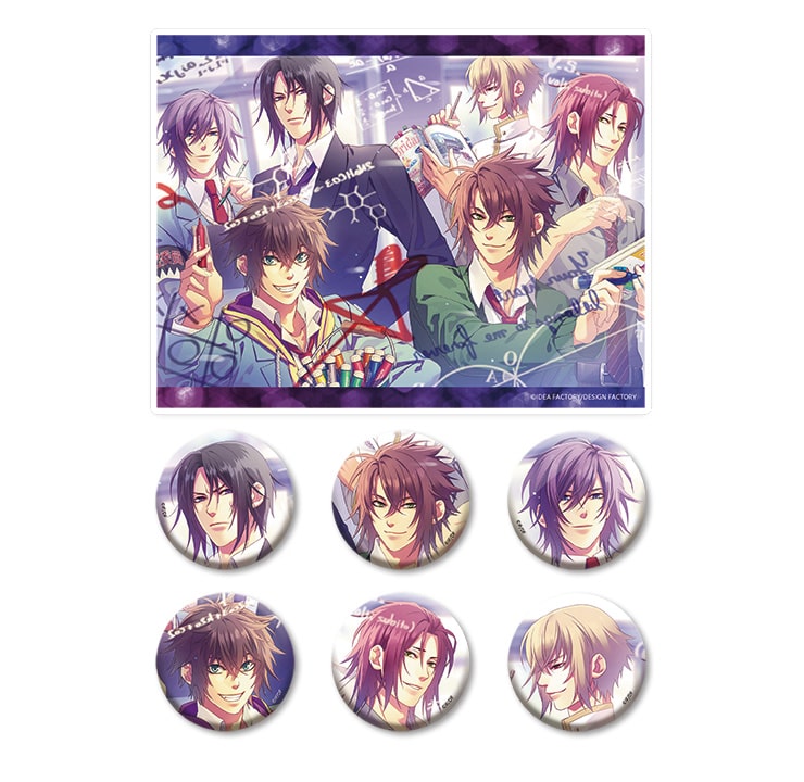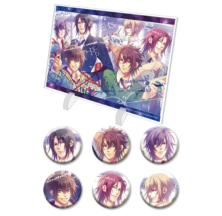 薄桜鬼SSL ~sweet school life~公式ストーリーブック 放課後篇、薄桜鬼SSL ~sweet school life~公式ファンブック 特別授業篇の描きおろし表紙イラストを配したアクリルパネルと缶バッジ6種のセットです。