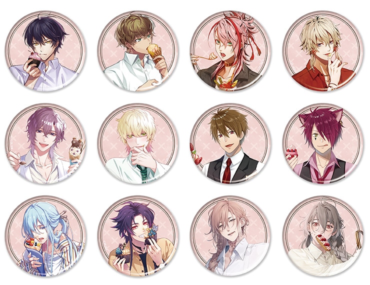 オトメイトのキャラクター描きおろしグラビア企画、“with sweets”シリーズから、B’s-LOG本誌2023年8月号~2024年1月号に掲載された、全12キャラクターを楽しめる直径56mmのトレーディング缶バッジです。