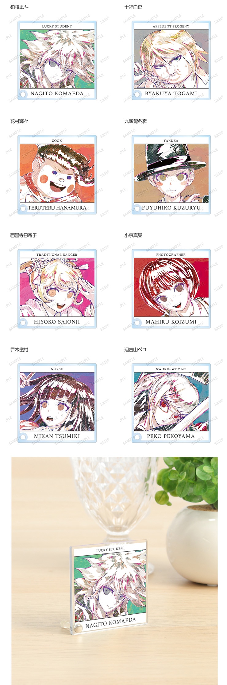 狛枝凪⽃、⼗神⽩夜、花村輝々、九頭⿓冬彦、⻄園寺⽇寄⼦、⼩泉真昼、罪⽊蜜柑、辺古⼭ペコのイラストを新たなタッチで魅⼒的に表現し、⼿のひらサイズのアクリルパネルに仕上げました。