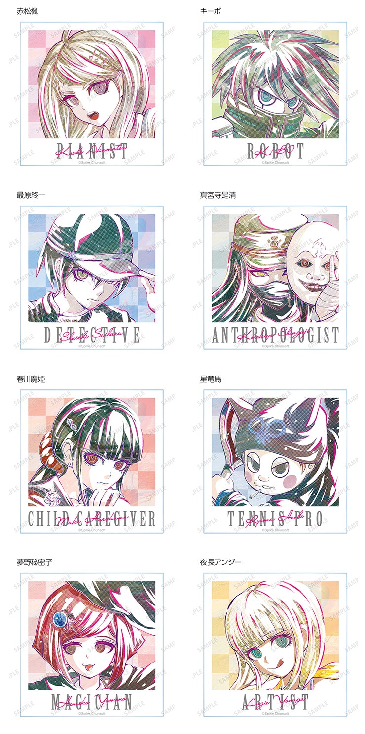 ⾚松楓、キーボ、最原終⼀、真宮寺是清、春川魔姫、星⻯⾺、夢野秘密⼦、夜⻑アンジーのイラストを新たなタッチで魅⼒的に表現し、アクリルカードに仕上げました。
