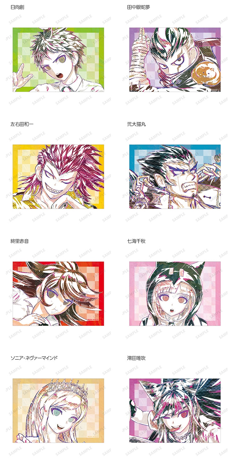 ⽇向創、⽥中眼蛇夢、左右⽥和⼀、弐⼤猫丸、終⾥⾚⾳、七海千秋、ソニア‧ネヴァーマインド、澪⽥唯吹のイラストを新たなタッチで魅⼒的に表現し、ブロマイドに仕上げました。