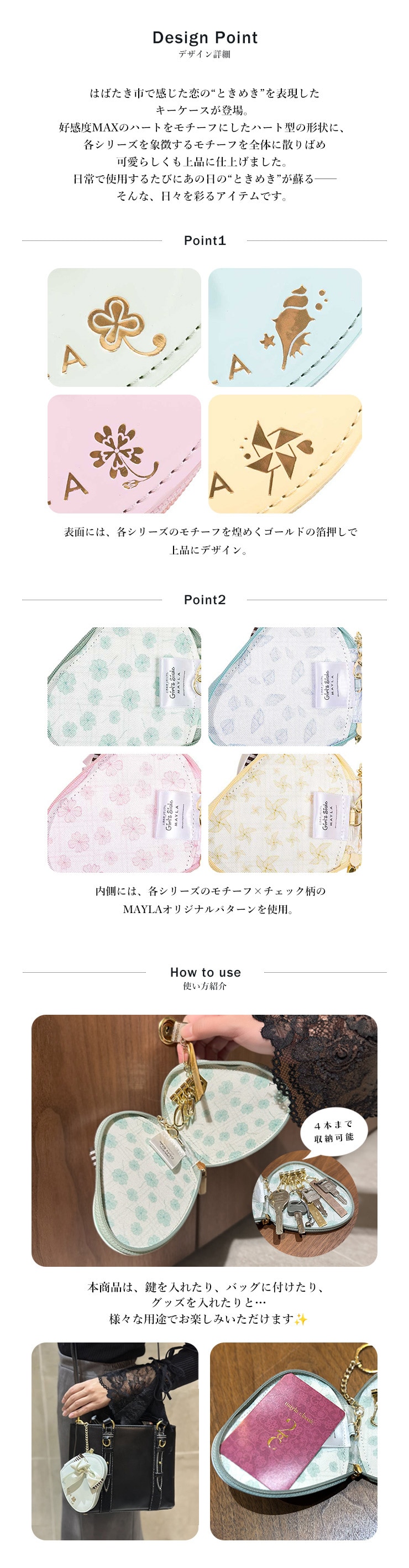 はばたき市で感じた恋の“ときめき”を表現したキーケースが登場。好感度MAXのハートをモチーフにしたハート型の形状に、各シリーズを象徴するモチーフを全体に散りばめ可愛らしくも上品に仕上げました。