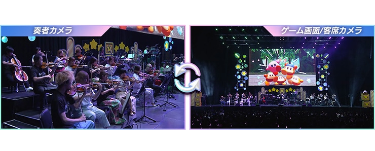 奏者の迫力ある演奏を楽しめる【奏者カメラ】と、会場のモニターに映されたゲーム映像や客席のペンライト演出の様子を俯瞰して見られる【ゲーム映像/客席カメラ】、2つのカメラを自由に切り替えてお楽しみいただけます。