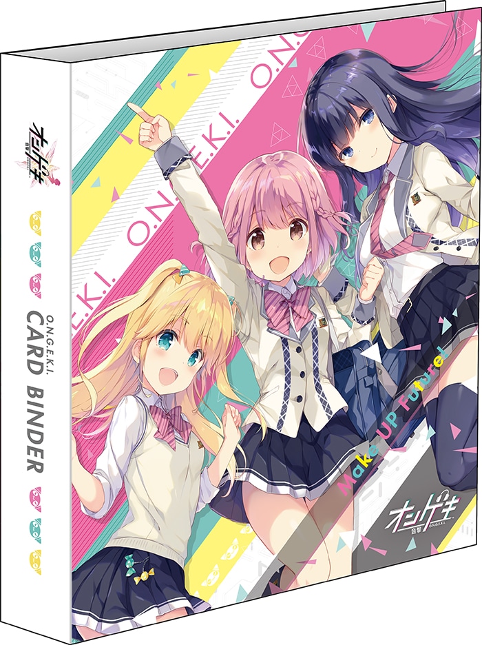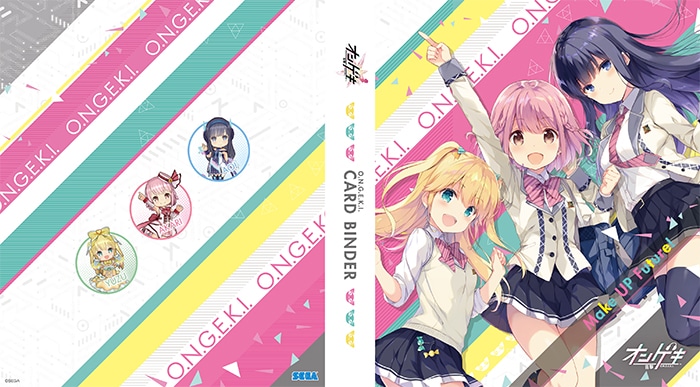 表面は「オンゲキ」のメインビジュアル、裏面はあかり、柚子、葵のデフォルメで可愛くデザインされた公式バインダー。