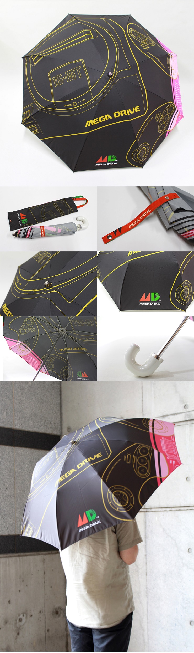 メガドライブのハード、コントローラーを各個別に使用したデザインとなっております。同デザインの共袋も付属しておりますので、雨の日のお出掛け時でもすぐ鞄に収納出来ます。高品質高級品のオーダーメイド傘となっておりますので、イベント時の使用はもちろん、贈り物として、コレクターズアイテムとしても最適の一品です。ハードデザインのトートバッグ、コントローラーデザインのポーチも同時発売です!