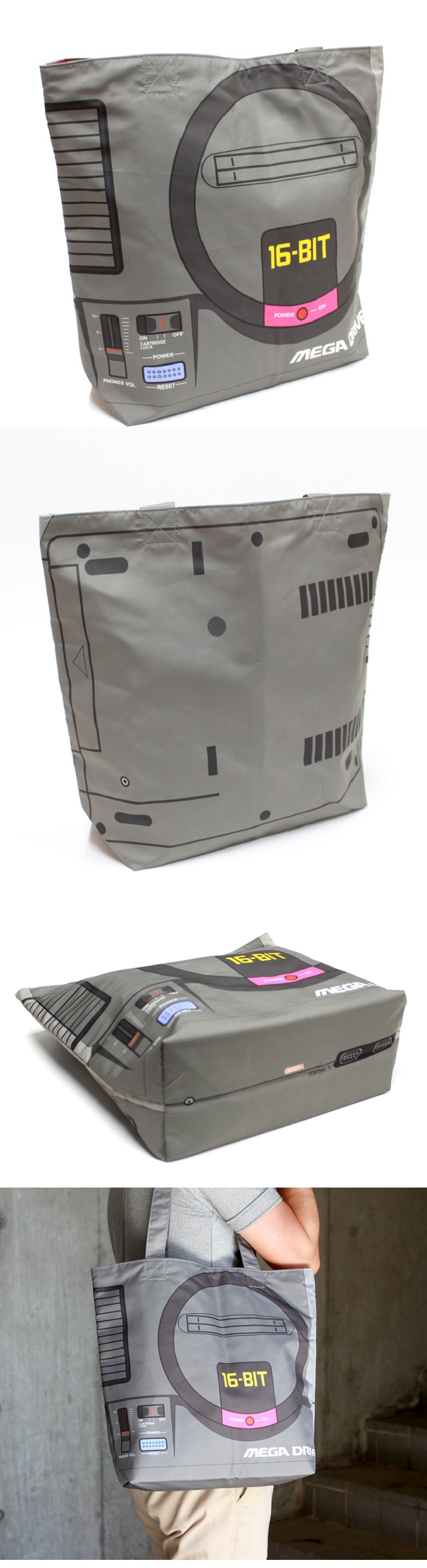 メガドライブのハードデザインを使用致しました。表面はハードの上部部分を再現したデザインとなっており、裏面もハードの下部部分を再現、更にトートバッグの底辺部分には、コントローラーを差し込む部分も再現されております。雨の日や水場でも安心して使用できるよう、撥水加工された傘生地を使用しており、ゆったり大き目サイズの丈夫なトートバッグです。ハードデザインの折畳傘、コントローラーデザインのポーチも同時発売です!