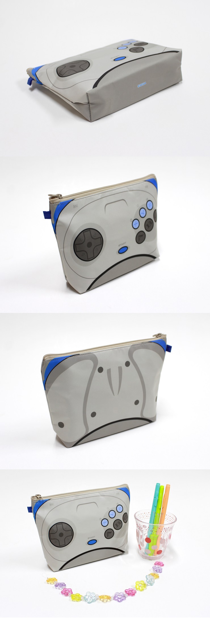 セガサターンのコントローラーデザインを使用致しました。表面はコントローラーのボタンやスティックのある上部デザインを再現し、裏面もコントローラーの裏を再現した、遊び心いっぱいのポーチです。撥水加工された傘生地を使用し、しっかりとした作りとなっておりますので、丈夫で長持ち、雨の日や水場でも安心してご使用いただけます。コントローラーデザインのポーチに合う、ハードデザインの折畳傘&トートバッグも同時発売です!