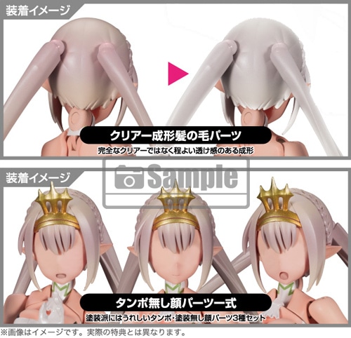 成型色は色分けがされ、顔はタンポ印刷で塗装済み、組み立てただけでイメージに近い仕上がりに。 3mm径のジョイント穴の採用で、シリーズ内でのパーツ互換性はもちろんのこと、すでに発売済みのコトブキヤプラモデルパーツの多くと組み合わせて遊ぶことができる。