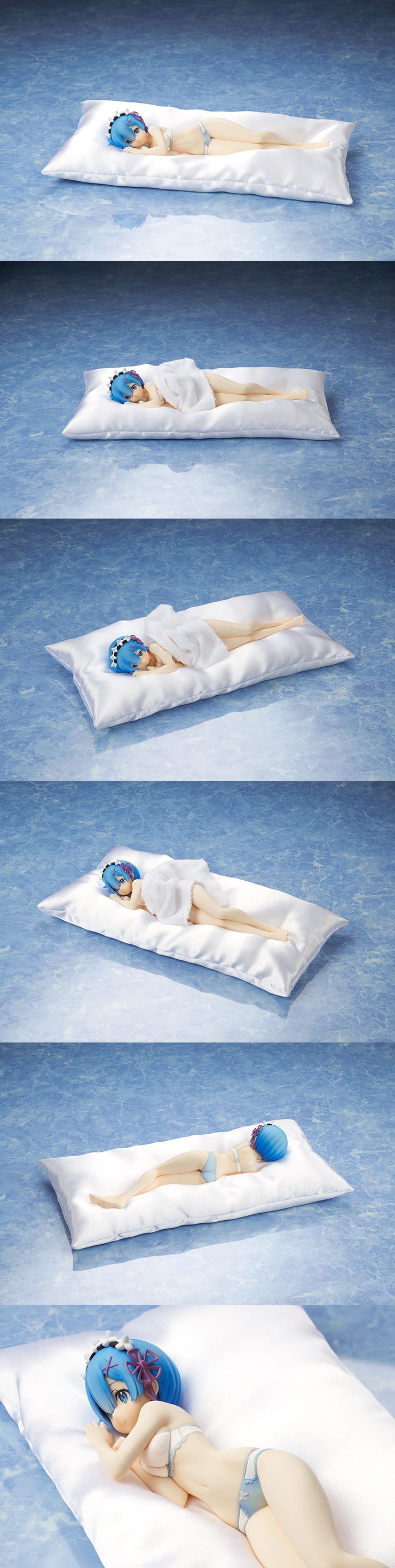 「抱き枕」用イラストをイメージベースに、添い寝するような可憐な姿を再現、ランジェリーにはレムのイメージカラーであるブルーをあしらいました。