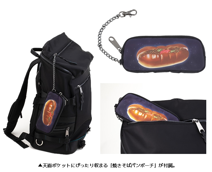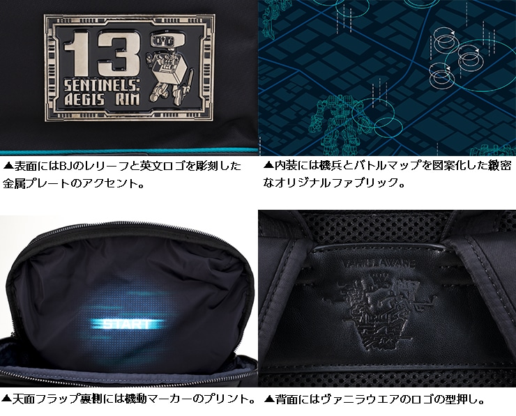 十三機兵防衛圏の濃厚な世界観を、密かに、しかし大胆に盛り込んだバックパックです。一見するとシンプルで機能的なブラックのナイロン製バックパック。しかし、表面にはBJのレリーフと英文ロゴを彫刻した金属プレートのアクセント。内装には機兵とバトルマップを図案化した緻密なオリジナルファブリック。天面フラップ裏側には機動マーカーのプリント。背面にはヴァニラウエアのロゴの型押し。そして、天面ポケットにぴったり収まる「焼きそばパンポーチ」の遊び心溢れるサプライズ!。随所にわかる人にはわかる仕掛けが潜むマニアックな特別仕様。背負うたび、密かな優越感を味わえる。十三機兵防衛圏リリース1周年を記念してデザインされた特別なバックパックです。
