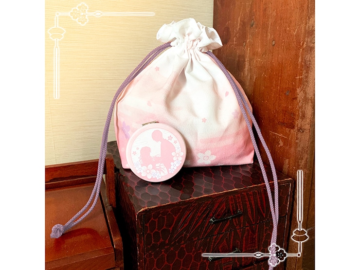 巾着は普段使いも出来る桜をモチーフのデザインで、チリメン素材を使用しており和の雰囲気が漂います。