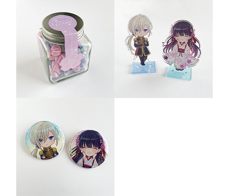 瓶入りのかわいい飴と、美味しい表情がかわいい美世・清霞の描きおろしちびキャライラストを使用したアクリルフィギュア・缶バッジのスペシャルセットです。