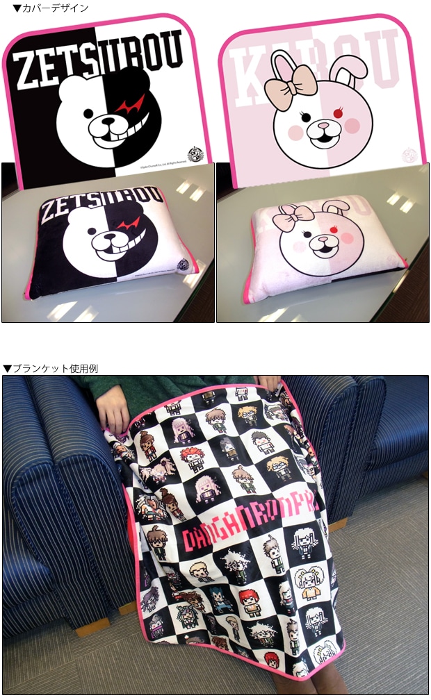 専用カバーの柄はKIBOUカラーのモノミとZETSUBOUカラーのモノクマ。ブランケットをしまえばクッションにもなります。