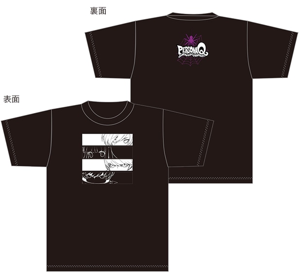 表面には、P3主人公、P4主人公、善、玲がプリント。裏面には作品ロゴと蜘蛛の巣がプリントされている。『ペルソナQ』のキャラクターがプリントされたTシャツを着こなしゲームも楽しもう!