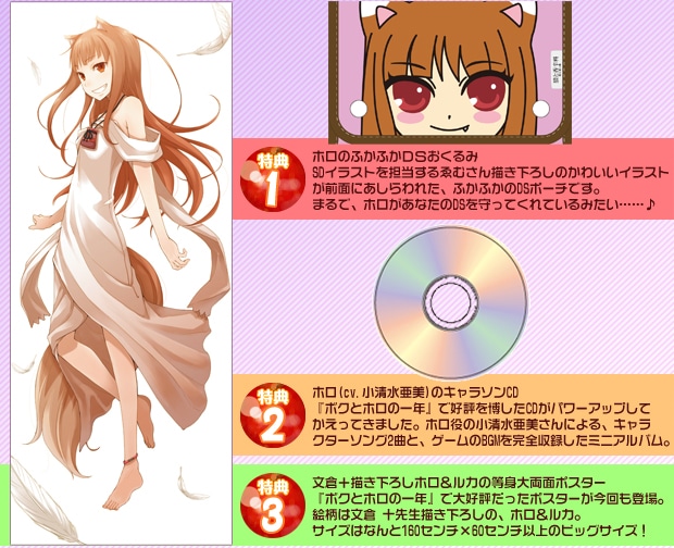 ニンテンドーDS専用ソフト 恋愛&行商シミュレーション主人公・ロレンスとなって、ホロと一緒に『狼と香辛料』の世界を旅しよう!ゲームでは、行商人として町から町を移動しながら商品売買をくり返し、お金を儲けながら旅を続けます。道中、ホロ&同行ヒロインとの恋愛イベントが多数発生! あなたはヒロインのお気に召す答えを選択しながら、親密度を上げていきます。