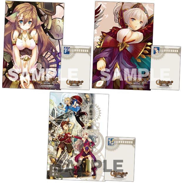 次期皇帝候補イオンともうひとりの候補カノン。ふたりのイラストをあしらったポストカード2種。そして「超輝工冒険団」の3人、ター坊、キャス、プラムを配したカードも付いたオリジナルデザイン3種セット。表面にもイオンのパートナー"テレフンケン"や"シャール"をワンポイントで配置。