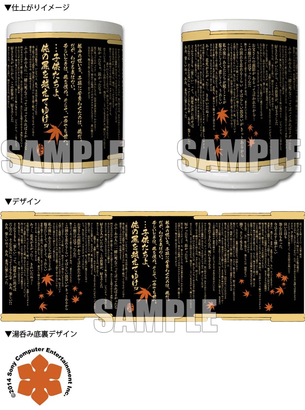 直径81×高さ104mmという大きめの湯呑に、俺屍ファンの心に先達の意気が響く、象徴的な一族の遺言を雲母金で焼付けた豪華仕様。