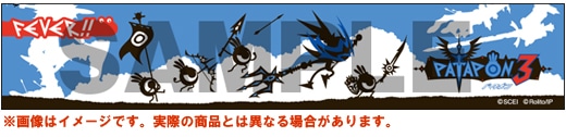 正しいリズムで叩くと発動するFEVER(フィーバー)!ノリノリのヒーロー&パタポンズをモチーフにしたマフラータオル。
