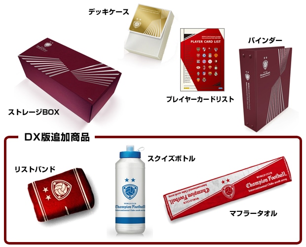 | バインダー 1冊 9ポケットリフィル 56枚 チームインデックス 34枚 ICカードセット台紙 22枚 扉絵 1枚 プレイヤーカードリスト 44P | ストレージBOX 1個 デッキケース 1個 EXカード 収納箱 DX版のみ:スクイズボトル、マフラータオル、リストバンド |