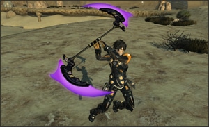 闇夜の色を帯びた時空をも断つ両剣。時に因果を無視してダメージを与えることもあるという、屈指の武器。