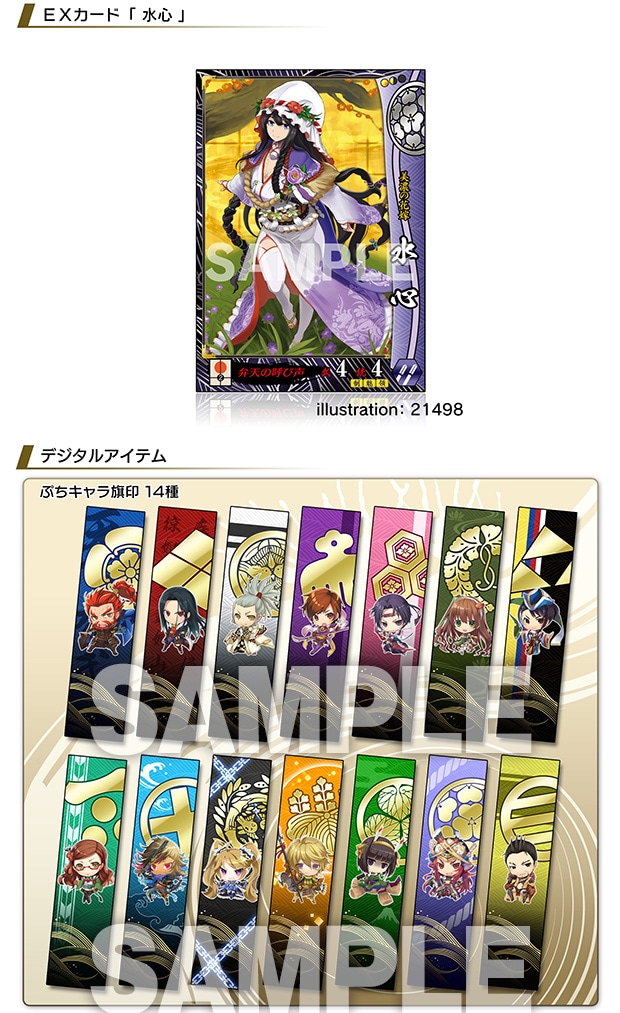 このビジュアルブック限定のEXカード「水心(イラスト:21498)」と、旗印が手に入る「アイテムコード」をお付けします。また有名絵師さんによる描き下ろしイラストや、ラフ絵など魅力的な内容盛りだくさんです。