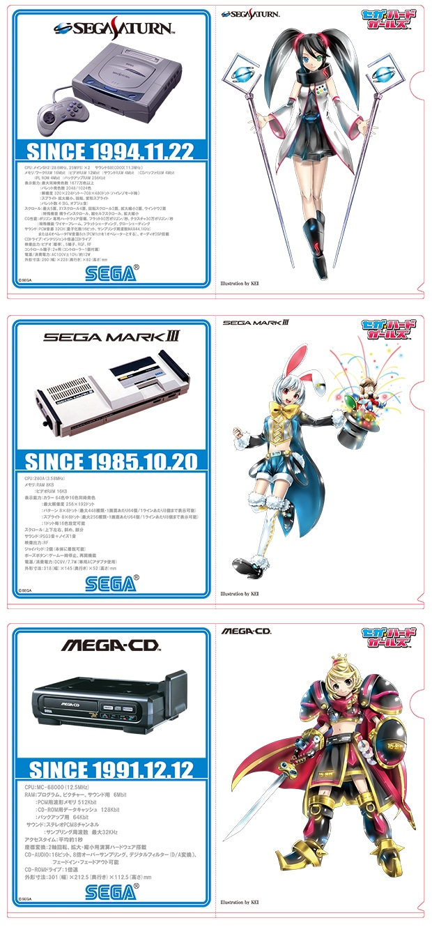 大好評につき『セガ・ハード・ガールズ』からクリアファイル3枚セットの第3弾が登場です!今回のハードは時代を彩った「セガ・マーク?」「メガCD」「セガサターン」の3人です。クリアファイルの表面にはキュートな『セガ・ハード・ガールズ』、裏面にはハード(本体)とスペックがデザインされています。各ハードの特徴とキャラクターを見比べてみては?